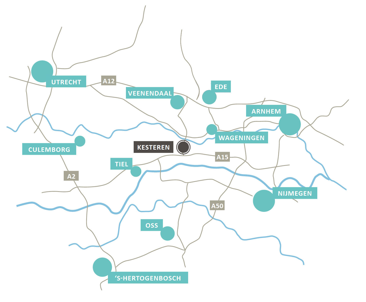 De centrale ligging is een niet te onderschatten pluspunt. Met de auto sta je binnen een kwartier in Tiel, Rhenen, Wageningen, Ede of Veenendaal. En in Nijmegen, Oss, Culemborg en Zaltbommel ben je in een halfuurtje. En de trein brengt je in een half uurtje naar Arnhem. Overal vlakbij dus!