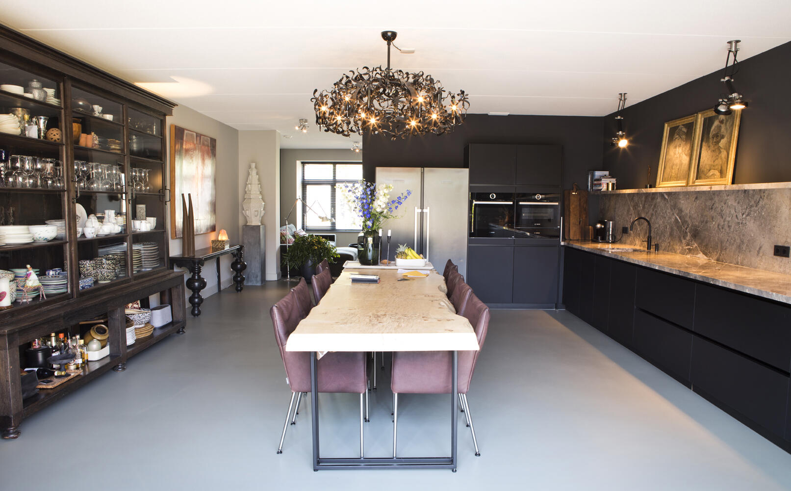 De matzwarte keuken is maar liefst 6,6 meter lang geworden met een werkblad en achterwand van Fiore di Bosco marmer en een Bora inductiekookplaat met geïntegreerde afzuiging. Voor de verlichting van het werkblad zijn industriële spots van Modular toegepast. Tegen de wand tussen keuken en zithoek is een groot wandmeubel met oven, magnetron en bergruimte geplaatst. Daarnaast staat een losse ijskast met dubbele deur.