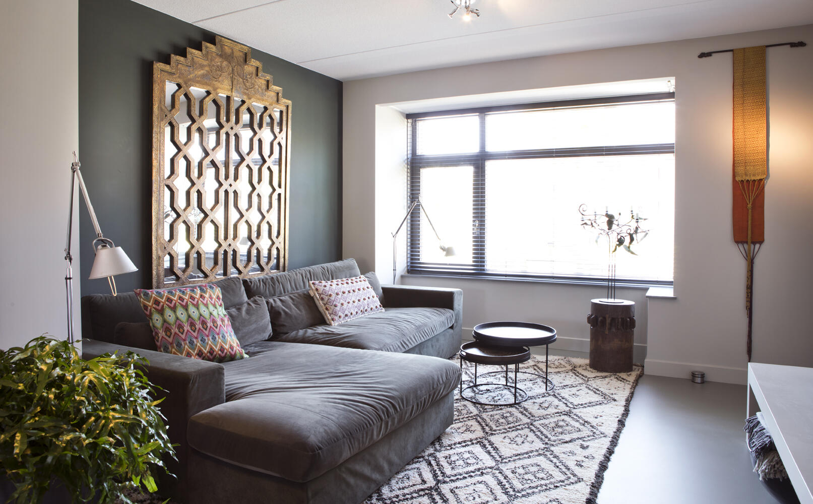 De zithoek aan de voorzijde van de woning wordt gedomineerd door de met velours beklede loungebank met daarachter een schitterende, enorm grote spiegel. “Die hebben we vanuit Iran naar Nederland laten vervoeren”, vertelt Cocky. Her en der vragen meer kunstvoorwerpen de aandacht. Dat samen eten belangrijk is, blijkt ook uit de grote eettafel op wielen achter de woning. Het open plafond boven de eettafel op het terras biedt mogelijkheden voor het aanbrengen van verlichting en planten.