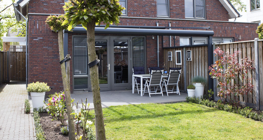 Het huis biedt volop mogelijkheden om thuis te werken, te studeren en muziek te maken. “Dankzij de uitbouw aan de achterkant hebben we een grote woonkamer en aan de voorzijde een keuken met eethoek. Ook in die keuken kan gewerkt worden met een laptop aan de eettafel. Aan de achterkant van de woning is een overkapping gemaakt, dus we kunnen eigenlijk overal lekker zitten en werken. De dubbele openslaande tuindeuren zorgen er bovendien voor dat we gemakkelijk van binnen naar buiten en andersom komen. Het loopt min of meer in elkaar over.” Als extra is er achter in de tuin ook nog een overdekte loungeplek!