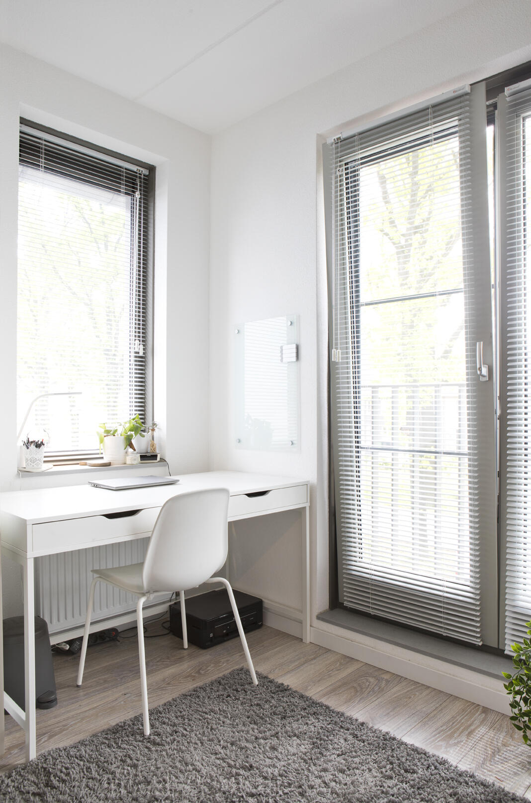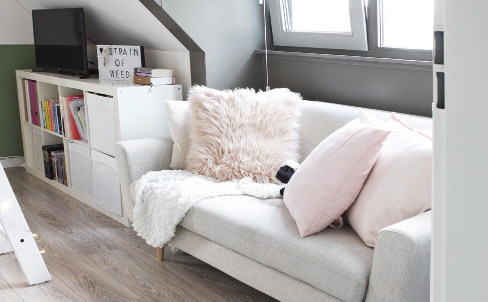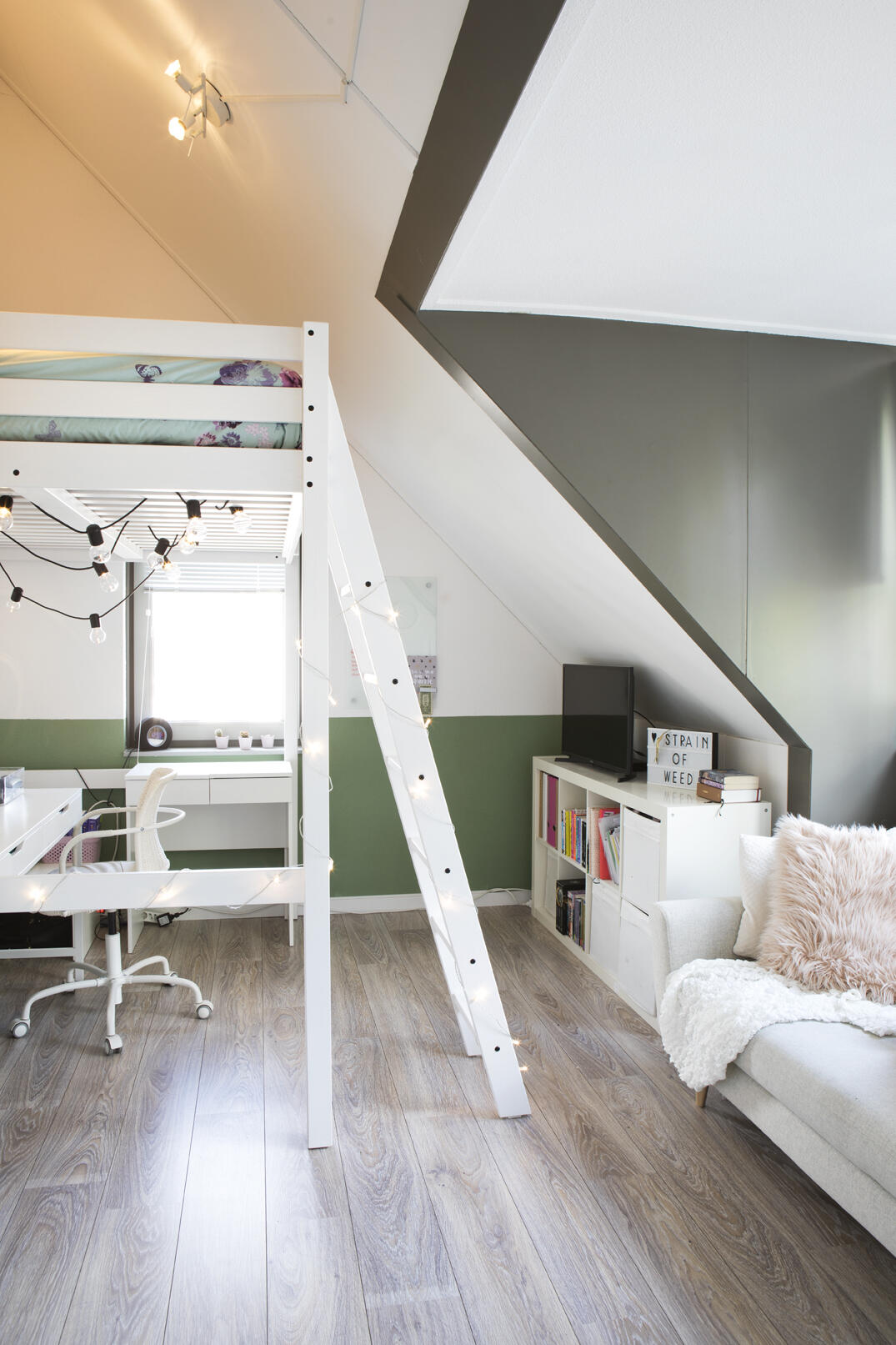 Voor de slaapkamers heeft de familie gekozen voor rustige, neutrale kleuren met houtlaminaat op de vloeren. Op de zolderslaapkamer biedt de dakkapel plaats aan een zitbankje. En dankzij de hoogslaper kan hier ook gewerkt worden. De badkamer - met inloopdouche, dubbele wastafel en toilet - is eveneens uitgevoerd in een overwegend lichte kleur, met donkergrijze vloertegels. “We hebben eigenlijk zo’n beetje alles bij Whoon in het Warenhuys gekocht. Dat is toch makkelijk, je hebt alles in één, je hebt één aanspreekpunt en ze kunnen alles goed laten zien in die fraaie showroom. We zijn super tevreden.