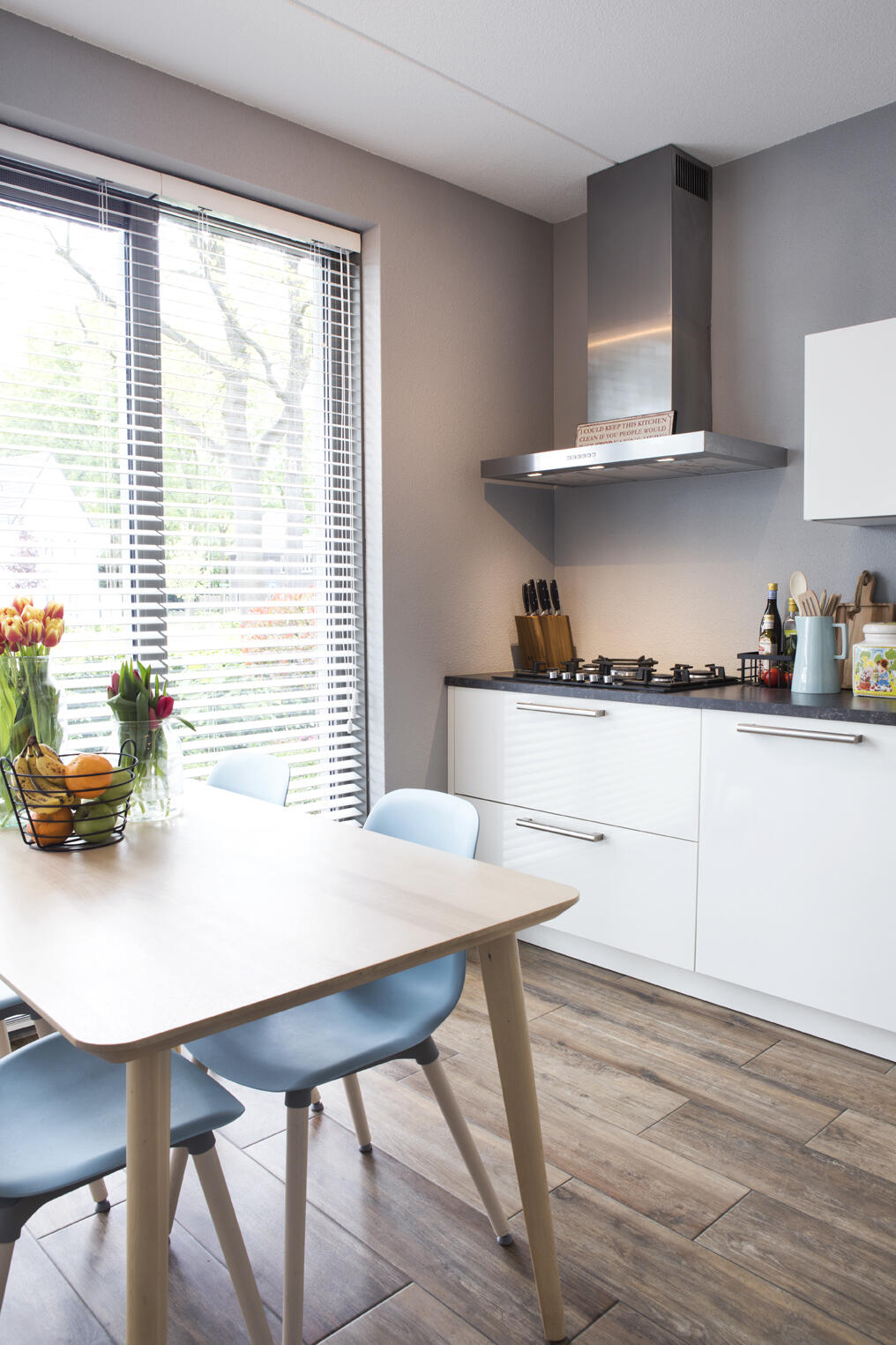 “Voor de kleuren in ons huis hebben we ons laten adviseren. Voor de bank hebben we een groengrijze stoffering gekozen en met het grijze tapijt definieer je dan de zitruimte iets meer. Het roze stoeltje geeft een leuk kleuraccent.” De tafels hebben houten bladen en een metalen onderstel. Op de benedenverdieping zijn de bovenlichten boven de deuren dichtgemaakt. Door de keuze voor een dichte trap is ook ruimte gecreëerd voor een trapkast. De keuken heeft witte fronten met metalen handgrepen en een donker, kunststof aanrechtblad. De houten keukentafel heeft een belangrijke functie. “Dat is echt een heel fijn plekje.”