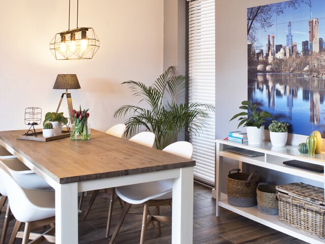 Voor de inrichting en afwerking van hun huis kozen Emma en Diederik voor een combinatie van Scandinavisch en industrieel. “Rustig en tijdloos was het uitgangspunt”, zegt Emma. Op de vloer is een tegelvloer in houtlook gelegd, gekocht bij het Whoon Warenhuys. De vloer (met vloerwarming uiteraard) oogt warm en is toch makkelijk schoon te houden.