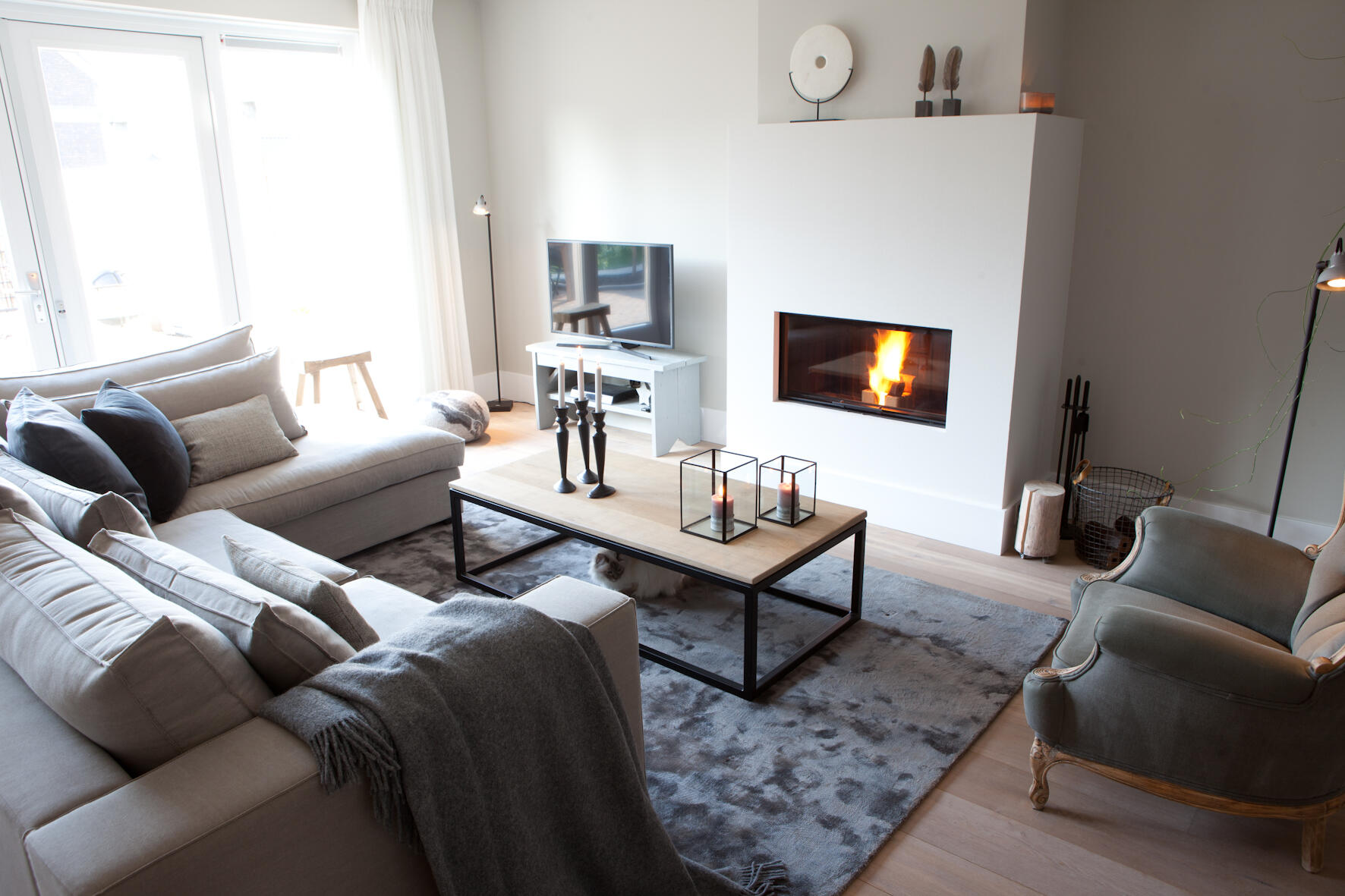 De brede, gesloten haard biedt sfeer en gezelligheid in de zithoek aan de tuinzijde. Een gashaard was hier niet mogelijk, omdat de woning niet op het gasnet is aangesloten. “Maar we konden deze haard wel in laten bouwen. Dat is natuurlijk heel sfeervol voor de donkere winteravonden.” Heel donker zal het niet gauw zijn in deze kamer met vooral lichte tinten, voorzien van een enkel accent. Mede dankzij de uitbouw van 2,40 meter is hier leefruimte te over.
