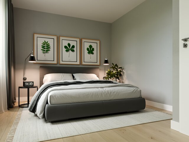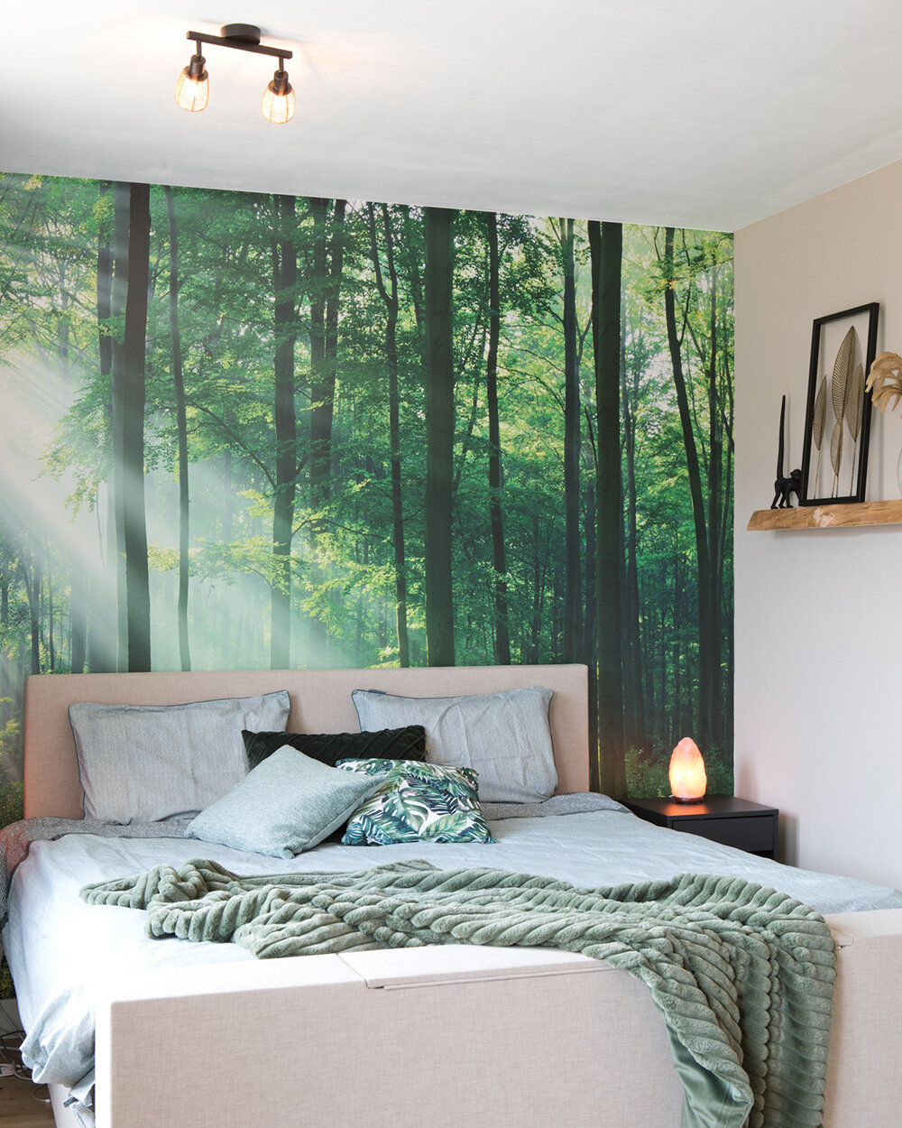 Tijd om de trap op te gaan voor de rust van de slaapkamers. De master bedroom aan de achterzijde van de woning biedt plaats aan een riant tweepersoons bed in een rustgevend bomenrijk decor. Wie denkt dat hier geen tv wordt gekeken, heeft het mis. Want die kan met één druk op de knop uit het voeteneinde omhoog getoverd worden. Om het ruimtelijk te houden ontbreekt de kast hier wel, want Angelo en Rosie hebben een van de kleinere kamers aan de voorzijde als inloopkast ingericht. De andere kamer fungeert als werkkamer. Op de hele eerste verdieping ligt laminaat.