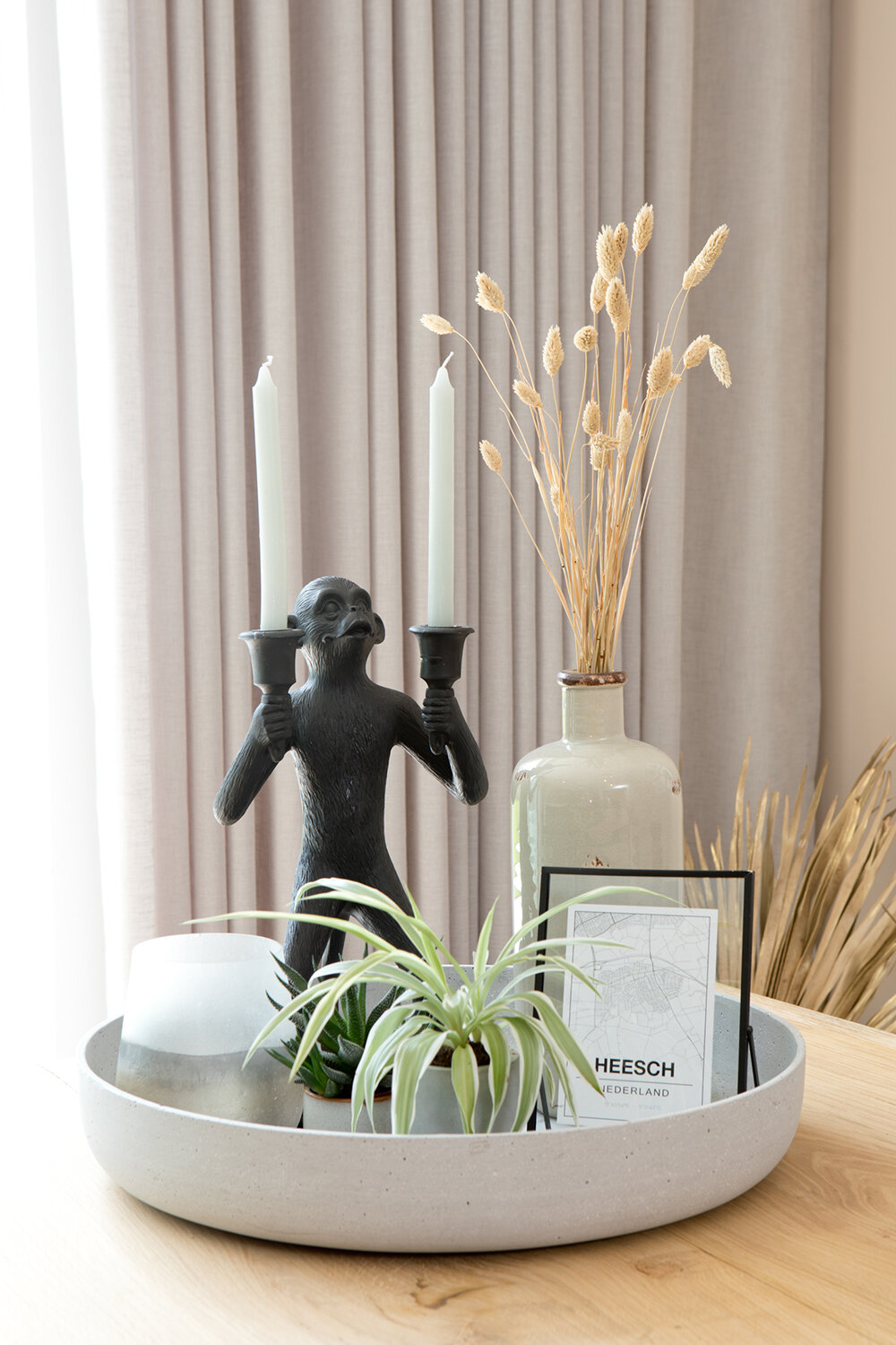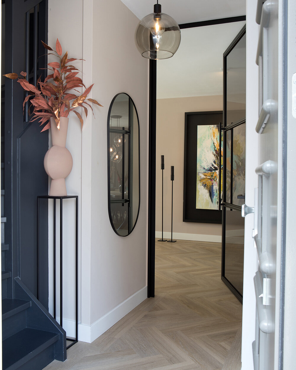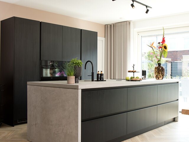 Voor de vloer en de wanden kozen ze voor lichte, warme tinten. De pvc-vloer met houtlook en visgraatmotief is de rustige basis waarop de meubels, veelal in meer donkere tinten, goed tot hun recht komen. “Die meubels hebben daarmee een wat stoerdere uitstraling.” Ze omschrijft de interieurstijl als een ‘combinatie van landelijk, industrieel en chic’. Een echte eyecatcher in de kamer is een groot, kleurig schilderij dat is gemaakt door de moeder van Rosie, kunstenaar Ans van Santvoort (www.ansvansantvoort.nl). Door de brede zwarte omlijsting springen de kleuren er nog beter uit. En de zwarte lijst biedt verbinding met andere zwarte elementen in de ruimte, zoals de stalen toegangsdeur (met getint glas) en de fronten van de keuken, die in een zwarte houtnerf zijn uitgevoerd. Opvallend in de keuken is verder het betonnen werkblad dat aan beide kanten doorloopt tot de vloer.