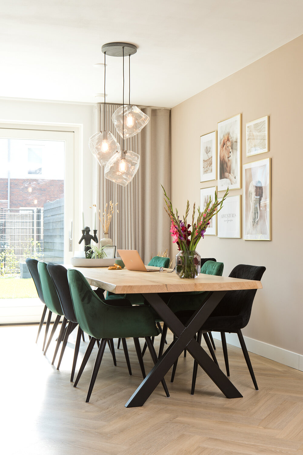 Ook aan de eettafel is een bijzonder verhaal verbonden. Het houten blad is gemaakt van een boom die Rosies vader ooit met zijn vader heeft geplant. Een mooi stukje verbinding met de familiegeschiedenis. Daarnaast is de eettafel ook lekker groot. Er is plaats voor maar liefst acht personen die gebruik kunnen maken van prettig zittende, met velours beklede eetstoelen in donkere zwarte en groene tinten. Natuurlijk kan er zonodig ook aan deze tafel gewerkt worden, bovendien met goed zicht op de achtertuin. “Die tuin gaan we in de toekomst nog mooier maken.”